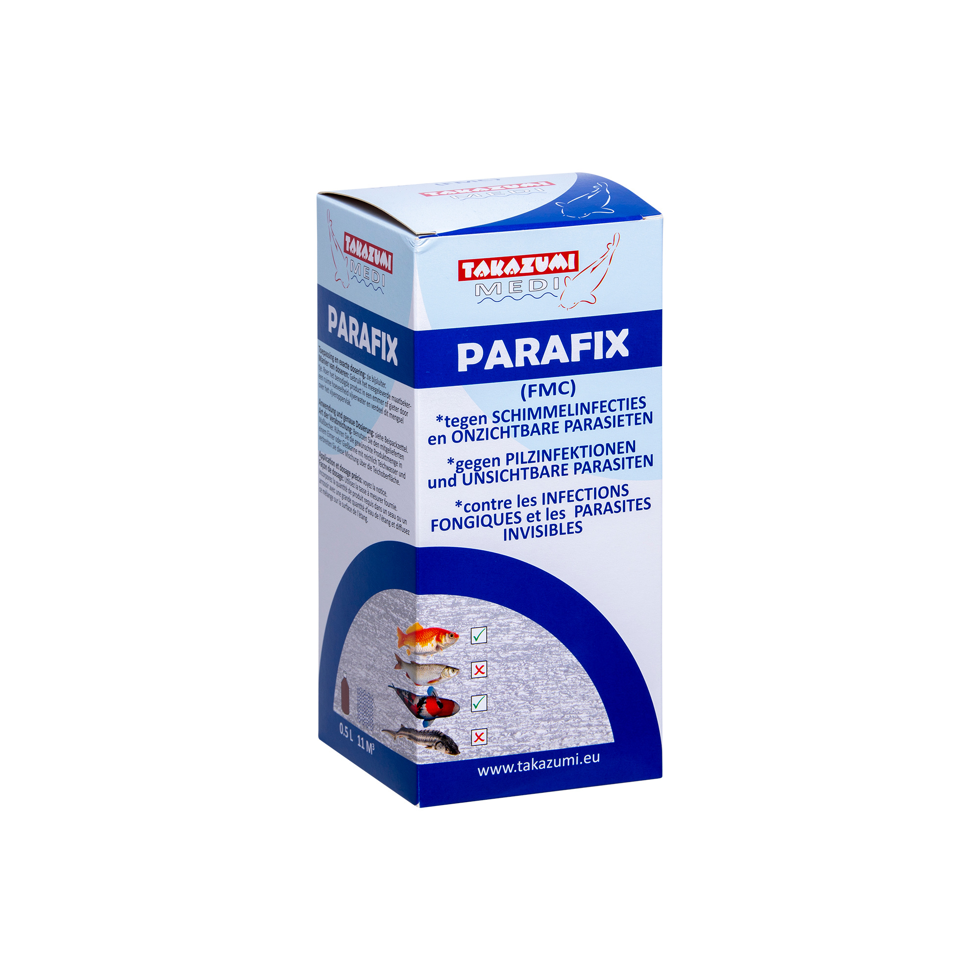 Takazumi Parafix is een diergeneesmiddel ter bestrijding van ééncellige huidparasieten en schimmels bij vijvervissen. Voorbeelden hiervan zijn: Witte stip (Ichthyophthirius multifiliis), Costia (Ichthyobodo necatrix), Chilodonella, Trichodina, Tetrahymena, Klokdiertjes (Apiosoma), Saprolegnia.