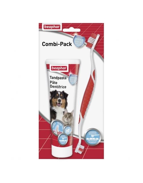 De Beaphar Tandenborstel biedt in combinatie met Beaphar Tandpasta (leversmaak) totale bescherming voor het gebit van uw hond of kat. Dagelijks poetsen gaat tandplak en de vorming van tandsteen tegen en zorgt daarnaast voor een frisse adem. De dubbele tandenborstel is geschikt voor alle honden en katten. Het rubberen handvat zorgt voor extra grip. De borstelharen zijn zacht en flexibel om het tandvlees te beschermen, ze zijn verschillend van lengte om alle plaatsen in de bek goed te bereiken.