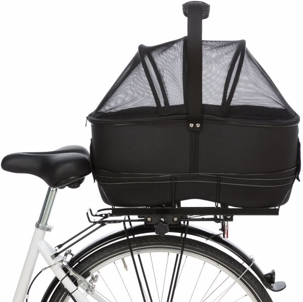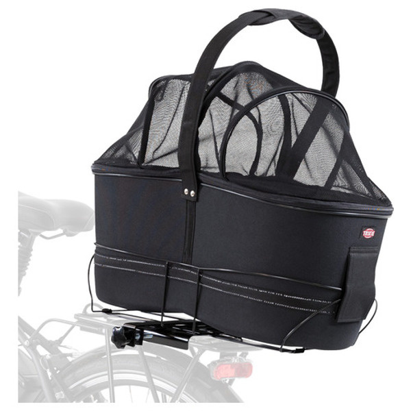 De mand zelf van deze fietsmand is gemaakt van vormvast EVA met gaasafdekking bovenop. Je kan de mand met behulp van het mechanisme vastmaken aan je bagagedrager. Dankzij de koepel en geïntegreerde korthouder zit je hond veilig in de mand en kan deze er niet uitspringen, toch kan hij tegelijkertijd wel genieten van zijn omgeving met de wind in de haren! Door het handvat bovenop is de mand ook makkelijk op te pakken en te dragen. De mand heeft reflecterende elementen voor extra zichtbaarheid in het donker. De mand is middels klittenband van het frame los te maken.