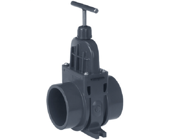 Degelijke VDL PVC Schuifkraan 75 mm, uitneembare pakking, lekvrij in alle posities. Nastelbare pakking langs bedienings-as.