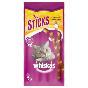 Deze Whiskas sticks bevatten 3 heerlijke snoepstokjes in de smaak kip. De verpakking bevat 3 sticks die individueel zijn verpakt om de snack lekkers vers te houden. De sticks zijn voorzien van handige breekpunten zodat je het snoepstokje in kleinere stukjes kan breken. Je kat zal het heerlijk vinden om te knabbelen aan de stick, maar je kan hem ook in stukjes breken en door de kamer gooien. Laat je kat maar lekker moeite doen voor zijn traktatie!